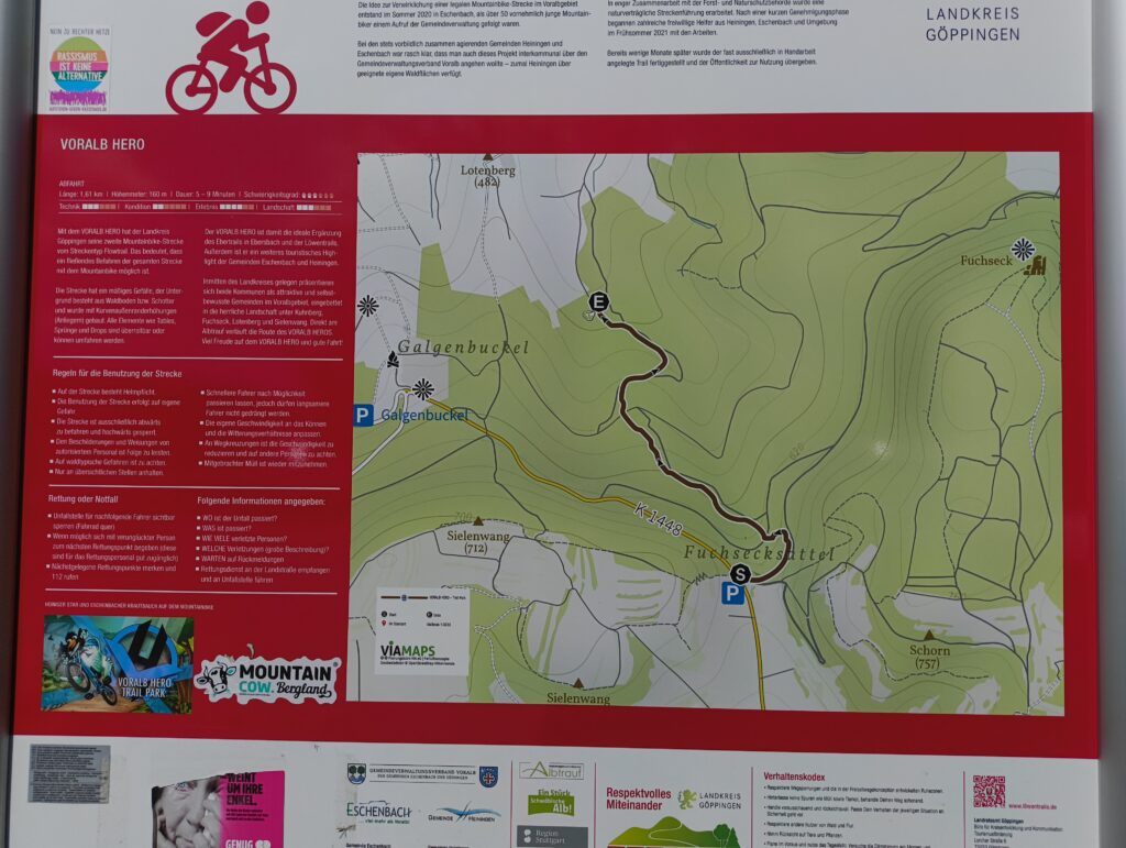 Ort: Heiningen / Eschenbach, Baden-Württemberg (Schwäbische Alb, Landkreis Göppingen) Area: Voralb / Albtrauf unter Kuhnberg, Fuchseck, Lotenberg, Sielenwang Länge: rund 1,6 km Flowtrail-Abfahrt Höhenunterschied: ca. 172 hm bergab Schwierigkeit: offiziell schwer / ambitioniert – alle Sprünge, Drops und Tables sind überrollbar oder umfahrbar Bauweise: fast komplett Handarbeit, ehrenamtlich gebaut ab Frühsommer 2021 Shuttle: nein – Uphill per Rissweg auf eigener Achse Regeln: Helmpflicht, Einbahn-Trail (nur abwärts), auf eigene Gefahr Eröffnet: Ende September 2021